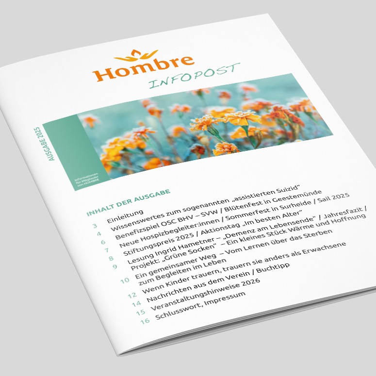 - Die Infopost ist eine Zeitschrift von HOMBRE. Neben Fortbildungsthemen informiert die Infopost ab 2020 1x im Jahr über die Aktivitäten im Verein. Für Mitglieder ist die Zeitschrift kostenlos. Wir möchten uns an dieser Stelle für die Unterstützung von Firma Döscher Bürozentrum GmbH und Lutz Eckhoff bedanken. Mitglieder von HOMBRE möchten wir ermutigen weiterhin Artikel einzusenden, um die Hospizarbeit bunt zu gestalten.