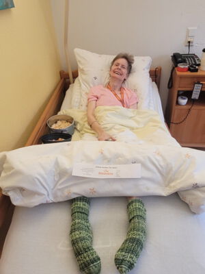 Die beiden Bilder, die diesen Beitrag begleiten, zeigen Petra Draheim, die in ihrer letzten Lebensphase von der Ehrenamtlichen Jutta Scharps begleitet wird. Petra erhielt ein Paar der selbstgestrickten grünen Socken – und war tief berührt. Sie erzählte, dass sie diese Geste sofort an ihre Kindheit erinnerte, als sie von ihrer Oma regelmäßig selbstgestrickte Socken bekam. Ein Moment voller Wärme, Erinnerung und Nähe.